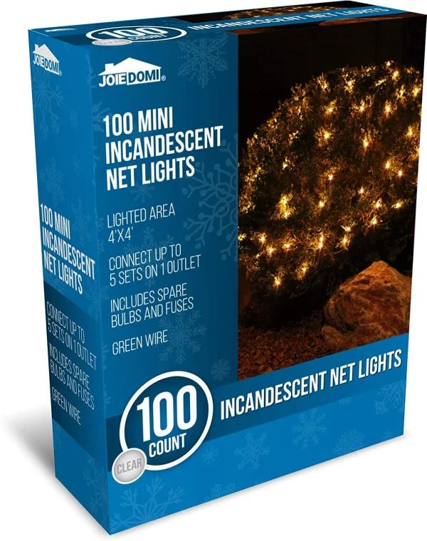 Light up your home with these vibrant Christmas net lights. Also use it for weddings, birthdays, or party decor both indoor or outdoor to add festivity! Joyfy Incandescent Net Christmas Lights features 100 bright Warm White mini-incandescent bulbs with green wires, spare bulbs, and fuses. Each set has a light area of 4 x 4 Feet. High Voltage. Simply plug in to the power socket and it will light up directly. Hang it up with decorative lights or use the icicle lights on the tree! You can connect up to 5 sets on 1 outlet. If one light goes out it will not affect the rest of it. Create your own winter wonderland this Christmas!