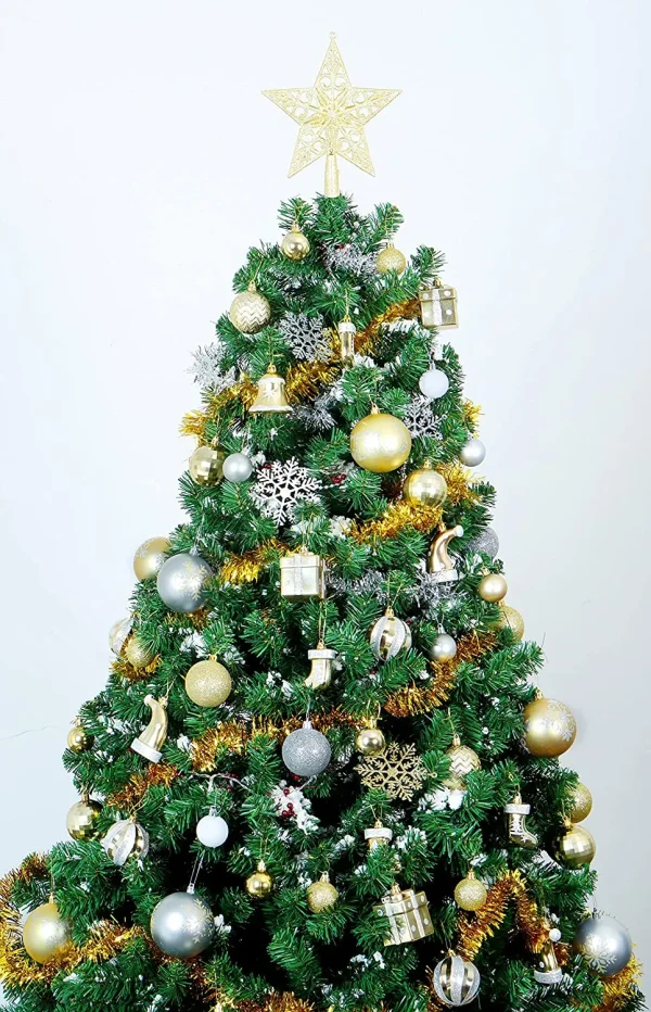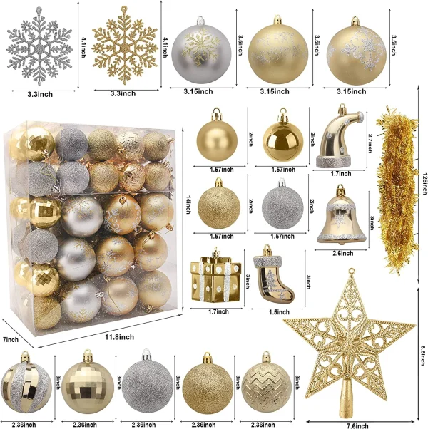 • Gold and silver Christmas balls includes 36 Glitter Balls, 10 Zigzag Balls, 10 Disco Balls, 18 Matte Balls, 9 Shiny Balls, 8 Swirls Balls, 4 Santa Hats, 4 Gift Boxes, 4 Stockings, 2 Bells, 4 Snowflakes, 2 Tinsel Garland, 1 Star Tree Topper.