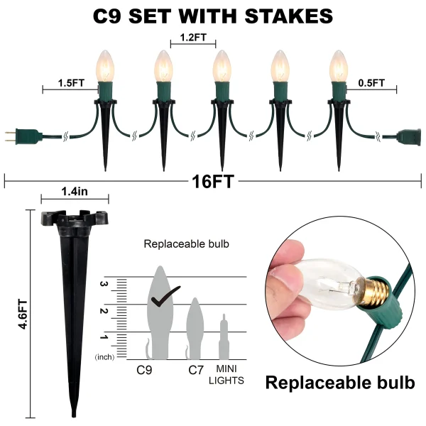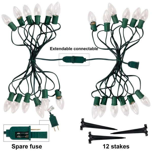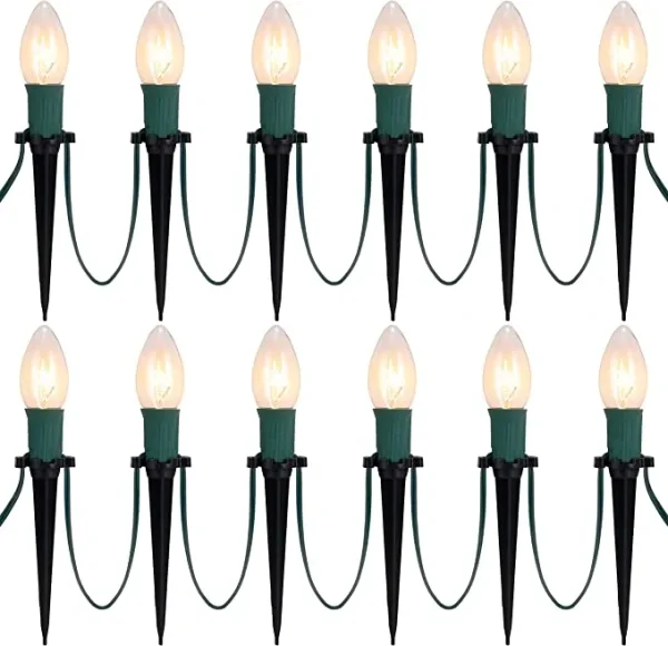 Our warm white Christmas pathway lights are the perfect addition to your outdoor decorations. Connectable strands to optimize the need for larger area lighting and festival decorations. These outdoor pathway lights will create a beautiful ambiance to Illuminate your indoor & outdoor, home, pathway, walkways, front yards, Christmas tree décor, and so on. These outdoor pathway lights come in a 15.75ft long strand with 12 C9 Warm White LED bulbs spaced 12″ inches apart on green wire. You can connect multiple strands end-to-end for longer reach or connect multiple light sets together in one location. With our C9 white warm string lights, you can add so much color to your home!