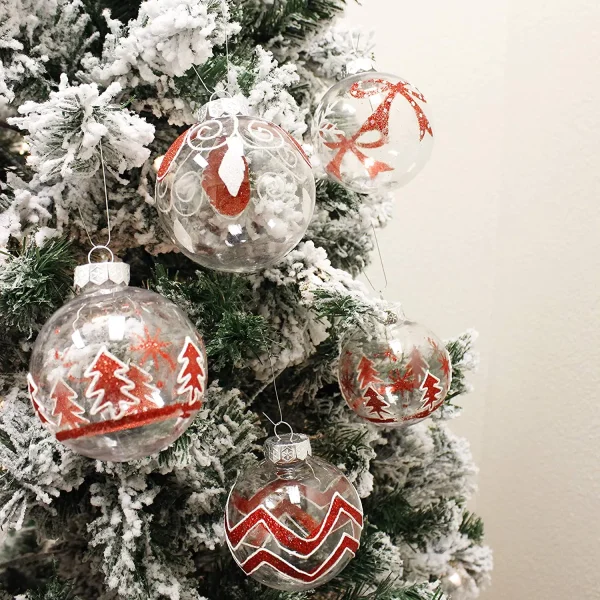 • Red and white Christmas ball ornaments include 12 pcs Clear Christmas Ball Ornaments Set with Snowflakes, Christmas Tree, and Bow Print on the ball ornaments. Perfect for indoor and outdoor decorations.