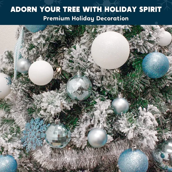 • Blue and white Christmas ornaments include 133 pcs Assorted Christmas Ball Ornaments of 15 Blue Shiny Balls, 15 White Balls, 14 Blue Matte Balls, 13 Disco Balls, 13 Blue Glitter Balls, 12 Stripes Icicles, 12 Zigzag Balls, 10 Blue Snowflakes, 9 White Snowflakes, 8 White Glitter Balls, 4 Quilted Balls, 2 Swirl Balls, 2 Spirals Balls, 2 Snowflake Balls, 2 Christmas Tree Balls. Perfect for indoor and outdoor decorations. Measuring 1.57, 2.36, and 3.15 inches.