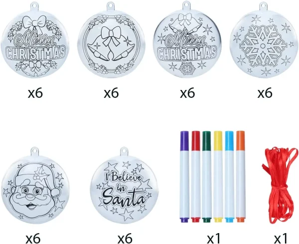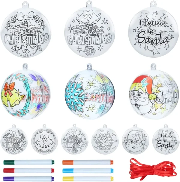 • Our Fantastic DIY Clear Plastic Christmas Ball Ornaments include 6 crayons,1 ribbon for 18 balls, and 18 pcs two-sided clear plastic Christmas ball ornaments in 3 different designs, including Santa Claus, Merry Christmas, snowflakes, bells, and other elements. Perfect for Christmas indoor and outdoor decorations!