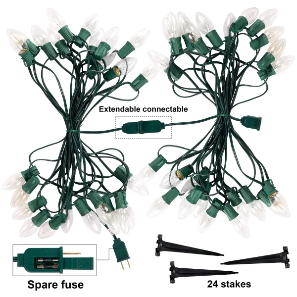 Bring the brightness of LED light Christmas lights to your home with these C9 pathway lights. The connectable Christmas outdoor decorations lawn lights are easy to install with a cable tie or cup hook, fix it or place it anywhere necessary. Connectable strands to optimize the need for larger area lighting and festival decorations. C9 white Christmas led pathway lights feature with 24 C9 warm white candle bulbs, which are super bright and energy efficient, they create a beautiful atmosphere to light up the houses and lawns. These connectable Christmas outdoor decorations and lawn lights can be used on trees, walls, or lawns. The perfect addition to take your house and business looking great for the holidays!