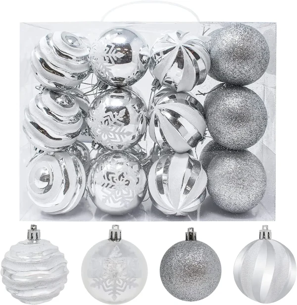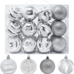 • Silver and white Christmas balls include 6 Wavy Stripes Balls, 6 Snowflake Balls, 6 Swirls Balls, and 6 Glitter Balls.