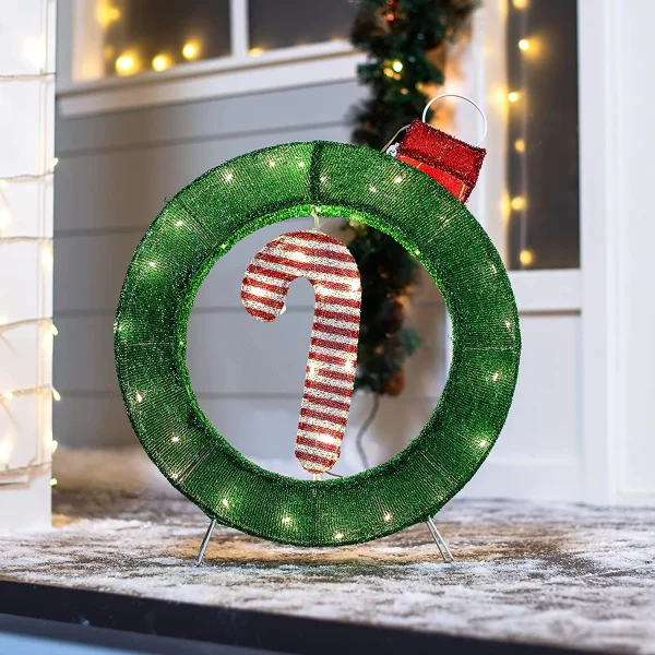 • LED candy cane decorations include a 2 Feet Tall Tinsel Candy Cane Ornament with 30 LED Warm White Lights in Clear Wire, Metal Stakes, and Zip Ties. Made of Tinsel Material.