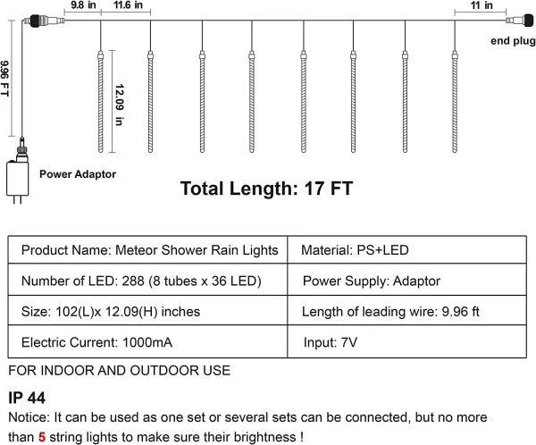 • The Christmas Lights Meteor Shower Rain Lights have 8 tubes on one strand, each tube is 30cm/12 inches long, 288 LEDs.