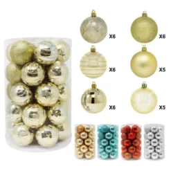 • Gold Christmas balls include 6 Quilted Balls, 6 Stripes Balls, 6 Disco Balls, 6 Glitter Balls, 5 Matte Balls, and 5 Shiny Balls.