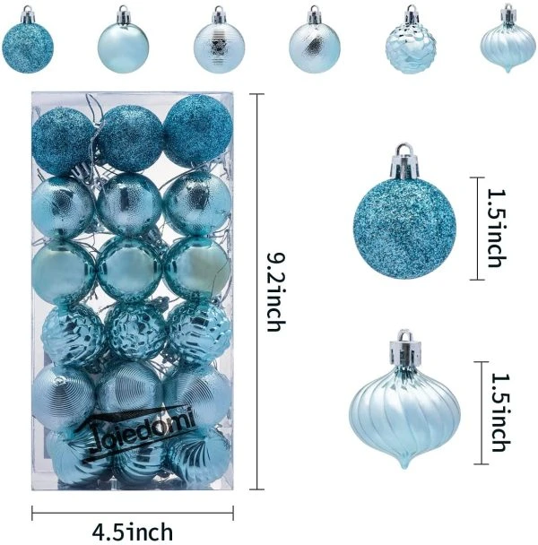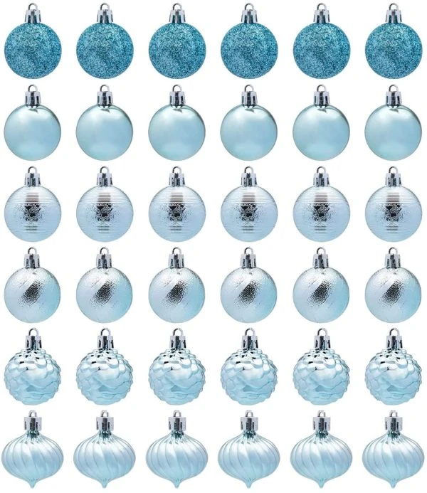 • Our Baby Blue Ornaments Set includes 6 glitter balls, 6 swirl balls, 6 swirls with bulge balls, 6 stripes Balls, 6 shiny balls, and 6 pinecone balls. The main colors are baby blue, teal, rose gold, gold, silver, and red. Each color is bright and beautiful and perfect for Christmas decorations!