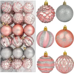 • Rose gold Christmas balls include 6 Stripes Balls, 6 Plaid Balls, 6 Spirals Balls, 6 Swirls Balls, 6 Glitter Balls, and 6 Snowy Pinecone Balls.