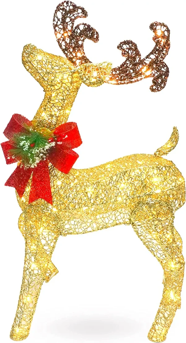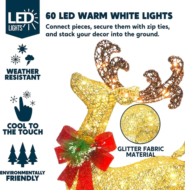 • Lighted reindeer yard decorations include a 3 Feet Tall Fabric Gold Buck with 60 LED Warm White Lights in Clear Wire, Metal Stakes, and Zip Ties. Made of Fabric Material.