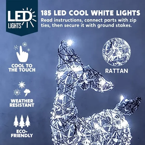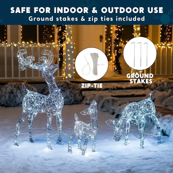 - Our 3 packs Christmas LED yard lights to include 3 rattan reindeers with 185 led cool white lights in clear wire, metal stakes. Made of rattan material. They are 2 ft (fawn), 3 ft (doe), and 4 ft (buck) feet tall.