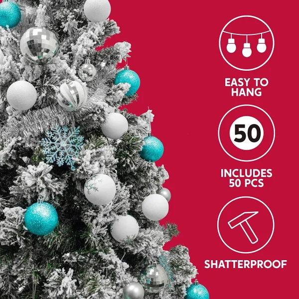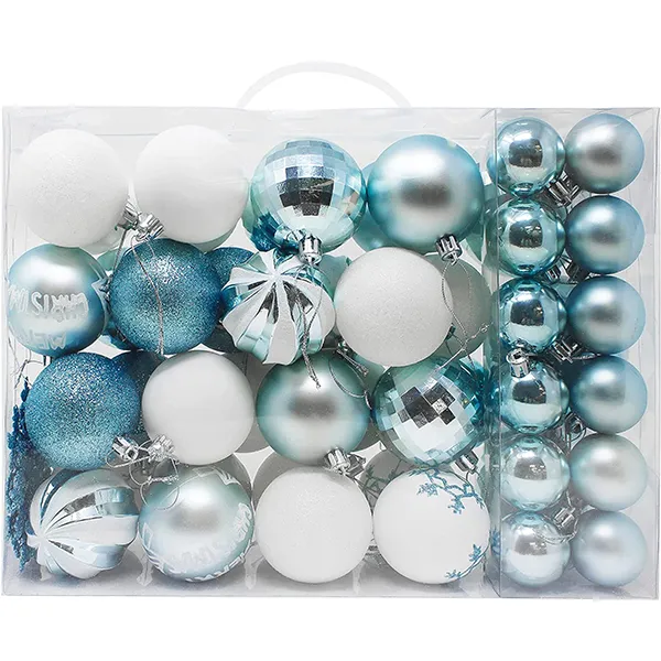 • Christmas shatterproof ornaments include 50 pcs Assorted Christmas Ball Ornaments of 10 Blue Matte Balls, 10 White Balls, 7 Blue Shiny Balls, 7 Disco Balls, 4 Glitter Balls, 3 Swirl Balls, 3 Hexagram Snowflake Balls, 3 Christmas Tree Balls, 3 Blue Snowflakes. Perfect for indoor and outdoor decorations for this Christmas Season. Measuring 1.57, 2.36, and 3.15 inches.