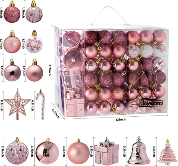 The rosegold and white assorted Christmas ornaments set comes with 12 Red Glitter Balls, 12 Red Shiny Balls, 6 Red Matte Balls, 6 Christmas Trees, 4 Swirls Balls, 4 Bells, 4 Gift Boxes, 3 Snowflake Balls, 3 Christmas Tree Balls, 3 White Snowflakes, 3 Red Snowflakes, 3 Diamond Plaid Balls, 2 Candy Canes, and 1 Red Star Tree Topper. Apart from its durability, the exquisite design adds up flavor to your decorations. These hanging Christmas ornaments are shatterproof because they were made with sturdy and eco-friendly plastic materials. Even if the ornaments are crushed. These colorful Christmas ball ornaments will captivate both children and adults as well as your neighbors!