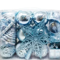 • Blue and white Christmas balls include 12 Red Glitter Balls, 12 Red Shiny Balls, 6 Red Matte Balls, 6 Christmas Trees, 4 Swirls Balls, 4 Bells, 4 Gift Boxes, 3 Snowflake Balls, 3 Christmas Tree Balls, 3 White Snowflakes, 3 Red Snowflakes, 3 Diamond Plaid Balls, 2 Candy Canes, 1 Red Star Tree Topper.