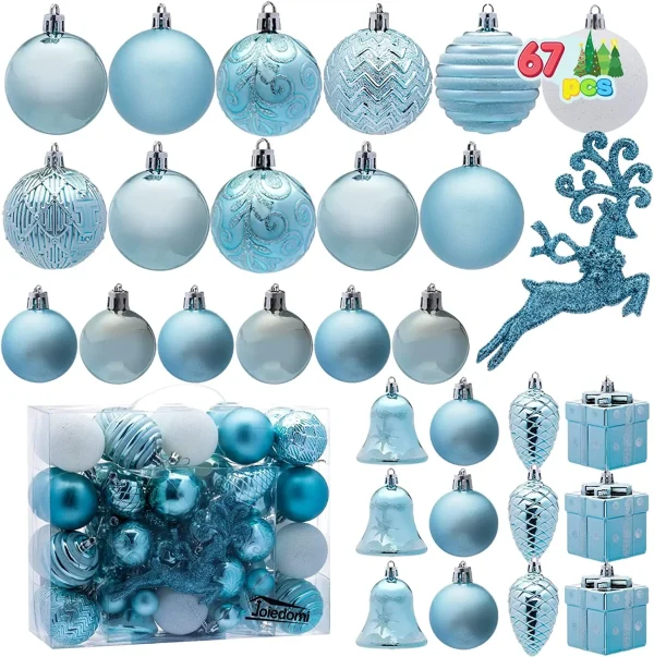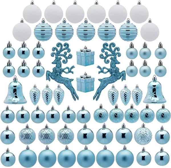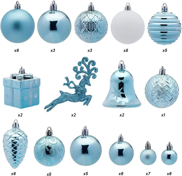 • Our Shatterproof Christmas Ornament Set includes 19 Shiny Balls, 13 Matte Balls, 8 Glitter Balls, 6 Pine Cones, 5 Snowy Balls, 5 Swirls Pattern Balls, 4 Diamond Plaid Balls, 2 Gift Boxes, 2 Flying Reindeers, and 2 Bells.
