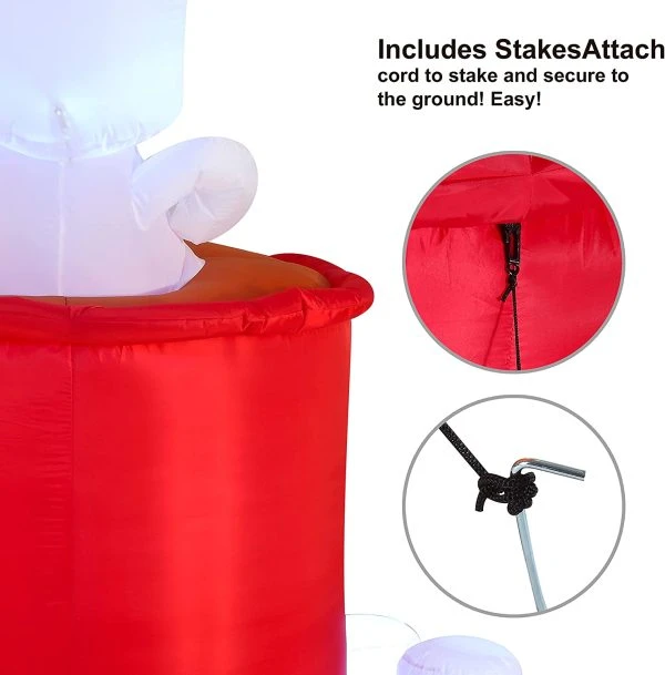 • Inflatable outdoor snowman 6 Feet Tall Inflatable Outdoor Snowman Mug comes with an extended cord, ground stakes, fastened ropes, built-in sandbags, and a plug with UL certification.