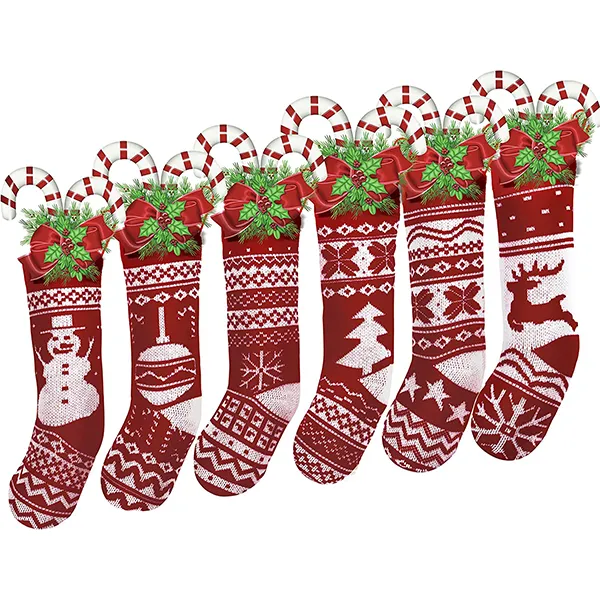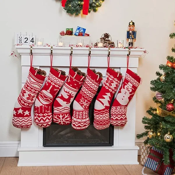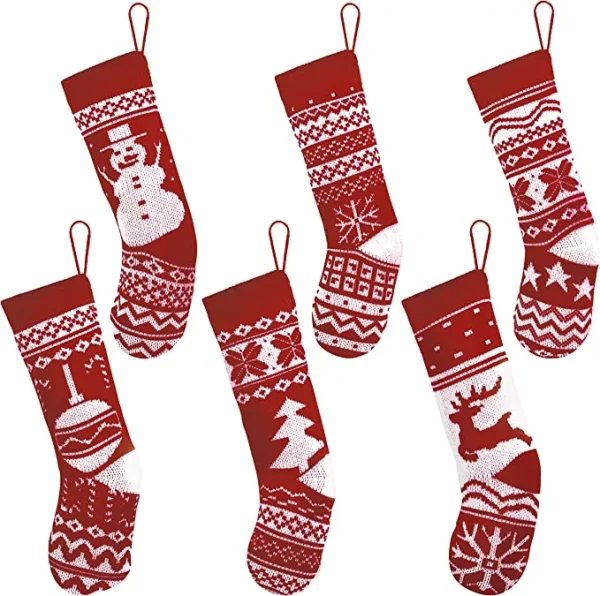 • Stocking decorations come with a pack of 6 Large Stocking Decorations knitted with patterns of reindeer, a Christmas tree, snowflakes, a snowman, and a Christmas Ball.
