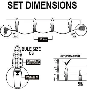 • C6 multicolor Christmas lights come with 70 counts of multicolor C6 Lights which have a length of 22.6 ft (6.9m). The set comes with Extra Bulbs & Replacement Fuses