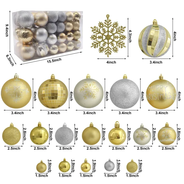 • Christmas ornaments balls include 88 pcs Assorted Christmas Ball Ornaments of 17 Shiny Balls, 13 Disco Balls, 11 Matte Balls, 21 Glitter Balls, 8 Snowflakes, 6 White Balls, 4 Snowflake Balls, 2 Hexagram Snowflake Balls, 2 Swirl Balls, 2 Spirals Balls, 2 Christmas Tree Balls. Perfect for indoor and outdoor decorations for this Christmas Season. Measuring 1.57, 2.36, and 3.15 inches.