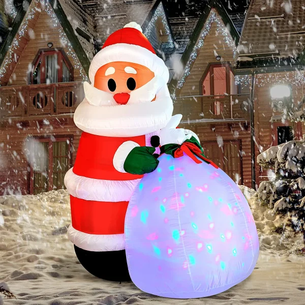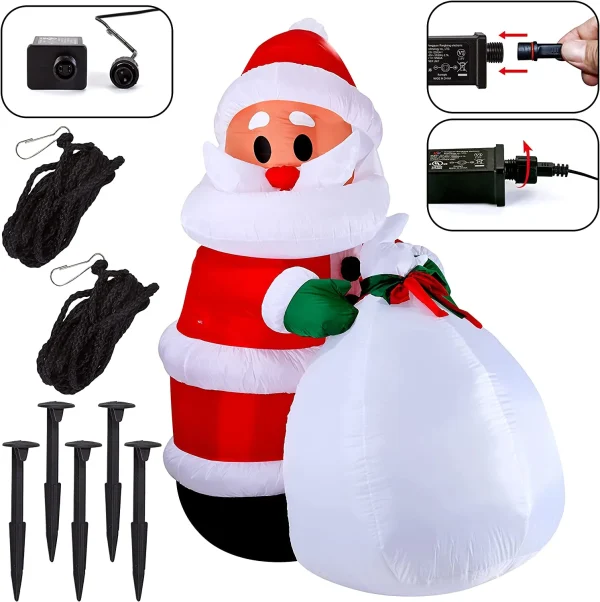 • Inflatable Santa Claus includes 7.9 Feet Tall Christmas Inflatable Santa Claus with Multicolor Gift Bag Inflatable comes with an extended cord, ground stakes, fastened ropes, built-in sandbags, and a plug with UL certification.
