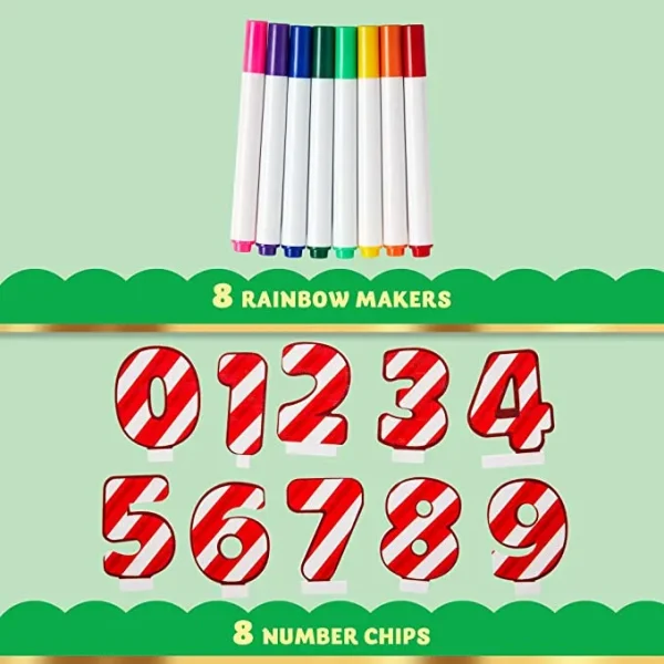 β’ Our DIY Christmas Ornaments machine includes a motorized whirler, 8 rainbow markers, 4 blank ornaments, 8 character chips, and 13 number chips.
