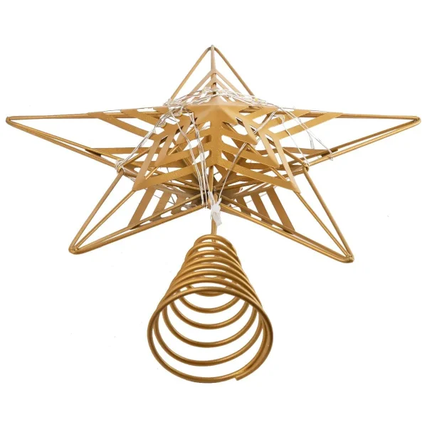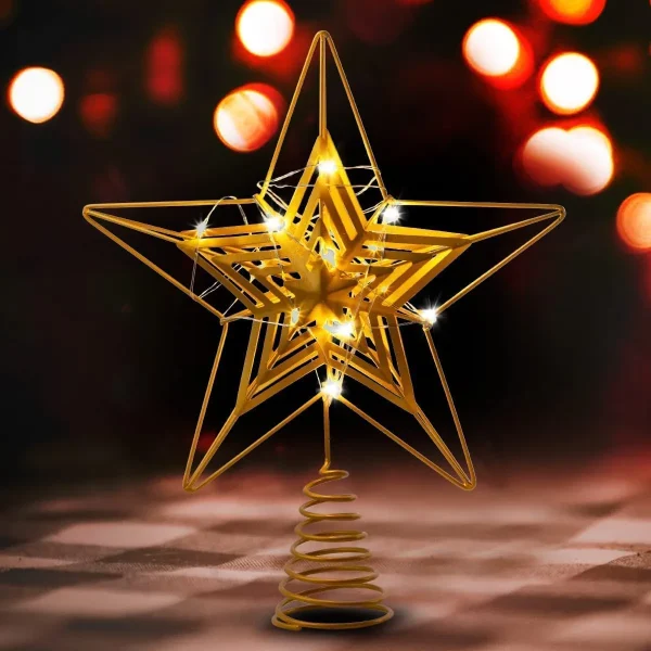 • This gold star Christmas tree topper adopts a traditional 5-pointed gold hollow star lighted with Warm White LED lights. An ideal choice to decorate your Christmas tree! The Gold Star tree topper is a size 9.5 inch * 12 inch, which is a perfect fit for a 6ft to 7ft Xmas tree.